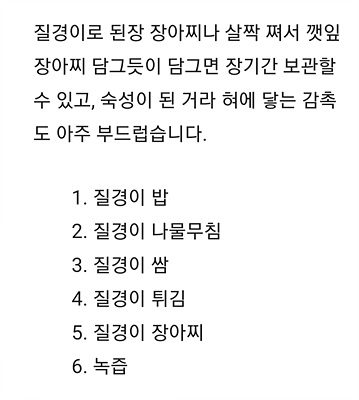 봄에는 여린 순을 따서 볶거나 데쳐서 먹고, 가을에 나는 씨는 말려서 약으로 사용하는데 잎은 주로 소금물에 살짝 데쳐서 나물로 먹거나 기름에 볶아서 먹으며 여름에 따서 좀 질기다면 삶아서 건조 후 나중에 물에 불려 먹으면 다소 연해집니다. 이외에도 튀김으로 먹거나 김치나 장아찌로 담그기도 하는데 맛이 독특한 편입니다.