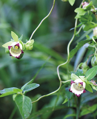 길이는 2~5m이고, 잎은 짧은 가지 끝에서 4장의 잎이 서로 접근해서 뭉쳐 있는 것 같으며 긴 타원형으로 길이는 3~10㎝, 폭은 1.5~4㎝입니다. 잎 가장자리는 밋밋하고, 표면은 녹색이지만 뒷면은 분처럼 하얀 빛깔을 띤 분백색이며 꽃은 겉은 연한 녹색이고 안쪽에는 자갈색 점이 있고 아래를 향해 피어 있습니다. 열매는 10~11월경에 익고 씨앗은 미세하며 더덕뿌리는 도라지처럼 굵고 덩굴을 자르면 흰 유액이 나오는데 뿌리는 식용, 약용으로 쓰이고 있습니다.