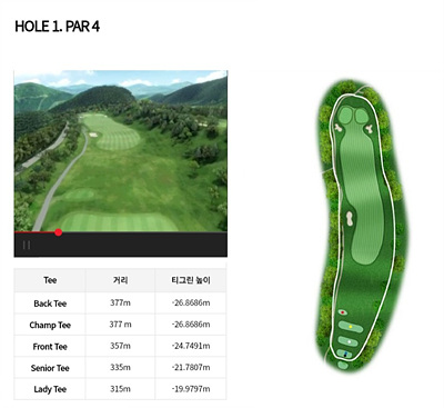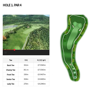 1번 홀은 파 4홀입니다. 총길이는 330m로 구성되어 있고, 약 24m 아래로 티샷을 진행합니다. 우측으로 약간 휘어진 도드렉홀로 세컨샷을 원활하게 하려면 중간 페어웨이에 안착이 중요한 홀입니다.
