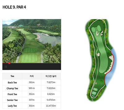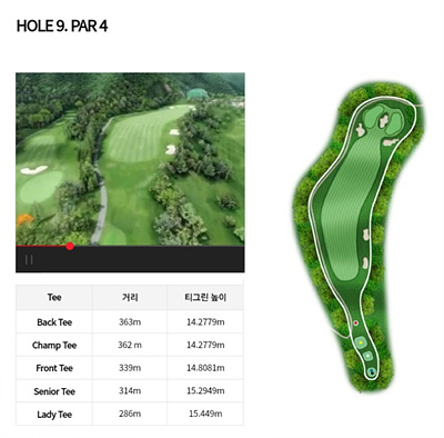 9번 홀은 339m의 파 4홀로 우측으로 휘어진 도르렉홀입니다. 전 지역이 OB지역으로 구성되어 있어 특히 주의가 필요하며 그린사이와 앞쪽에 배치된 벙커도 신경이 쓰이는 홀입니다. 벙커를 고려하여 세컨드샷을 하는 공략이 필요합니다.