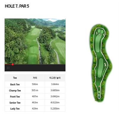 7번 홀은 487m의 파 5홀입니다. 페워웨이가 두 개로 나뉘어 있는 홀로 거리를 감안한 공략이 필요합니다. 좌우가 모두 OB지역이며 그린 앞쪽에 배치된 3개의 벙커가 특히 주의해야 할 장애물입니다.