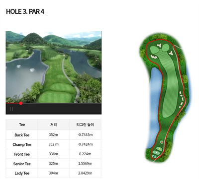 3번 홀은 338m의 파 4홀입니다. 좌우에 시원한 연못이 있어 환상적인 경치를 보이는 홀이지만 골퍼에게는 경치보다는 공략이 중요할 것입니다. 좌우 모두 OB로 주의가 요망됩니다.