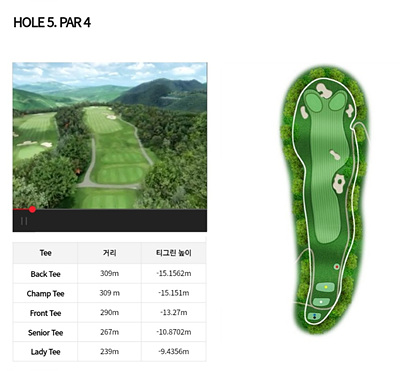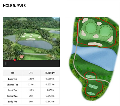 5번 홀은 290m의 짧은 파 4홀입니다. 페어웨이 우측과 그린 주변에 벙커가 위치가 있어 초보자는 다소 부담을 가질 수 있으나 편안한 마음으로 욕심을 버리고 샷을 하면 파세이브가 무난한 홀입니다.