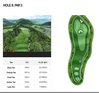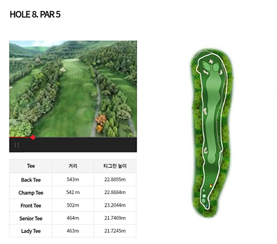 8번 홀을 502m의 긴 거리와 좌우가 모두 OB로 구성된 비교적 난도가 있는 홀입니다. 23m 높이로 티샷을 해야 하며 드라이브 거리가 짧거나 초보자에게는 다소 어려운 홀일 수 있습니다.