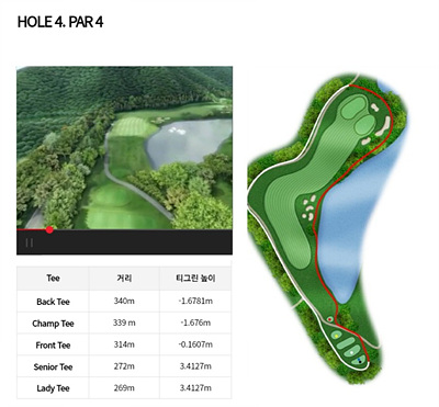 4번 홀은 314m의 우 도그렉 홀입니다. 우측에 연못이 있어 그린까지 전 지역이 해저드로 구성되어 있습니다. 페어웨이는 무난하나 도그렉 이므로 거리를 고려한 공략이 필요합니다.