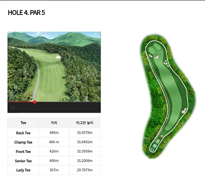 4번홀은 426m의 길지 않은 파 5홀입니다. 하지만 좌로 휘어진 도드렉홀이며 그린에 도달하기 전에 벙커가 위치해 있어 공략에 참고해야 하겠습니다. 전략을 잘 짜면 무난히 파세이브 또는 버디도 노려볼 만한 홀입니다.