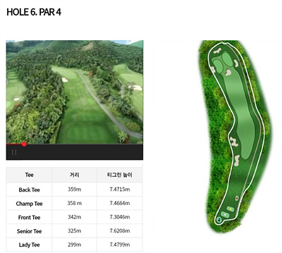 6번 홀 342m의 길이로 좌 도그렉으로 구성된 홀입니다. 티샷이 페워웨이에 도달하기 전 왼쪽에 벙커가 있고 그린 앞과 좌우에 벙커가 있어 고려하여 공략이 필요합니다.