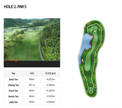 2번 홀은 483m의 파 5홀입니다. 왼쪽에 시원한 연못이 있어 해저드가 우려되며 나머지 부분은 모두 OB로 지역으로 되어 있습니다. 그린 주변에 벙커가 있어 공략에 주의가 필요합니다.