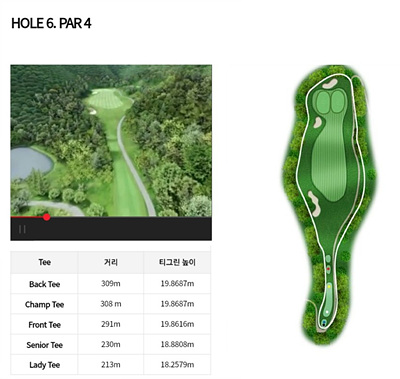 6번 홀은 291m 거리의 비교적 짧은 파 4홀입니다. 티샷으로부터 페어웨이까지 다소 좁게 구성되어 있어 신경이 쓰일 수 있으나 티샷만 정확하게 하면 무난히 파세이브를 할 수 있는 홀입니다.