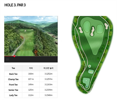 3번 홀은 149m의 파 3홀로 그린과 그린사이 그리고 그린 옆쪽에 벙커가 있어 주의가 필요합니다. 하지만 무난하게 공략을 할 수 있는 홀입니다.