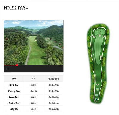 2번 홀은 332m의 비교적 짧은 파 4홀로 약 32m의 내리막으로 티샷을 하며 좌우가 모두 OB이므로 주의가 필요한 홀입니다. 그린 중간 오른쪽과 그린 앞쪽에 벙커가 있어 주의가 필요합니다.