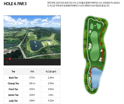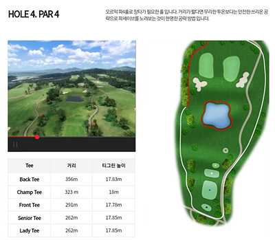 4번 홀은 291m의 오르막 파 4홀로 장타가 필요한 홀이며 페어웨이 중간에 있는 연못이 신경 쓰이는 홀입니다. 연못의 해저드와 그린 주변의 벙커를 피하는 공략이 필요합니다.