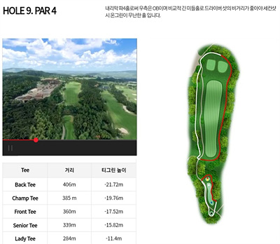 9번 홀은 360m의 파 4홀이며 내리막이 18m로 거리는 비교적 짧으나 페어웨이의 우측이 해저드이고 좌측이 OB지역이며 티샷 앞쪽에 숲이 있어 신경이 쓰이는 홀입니다.