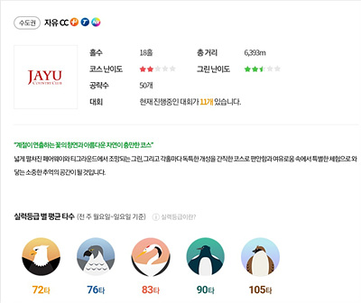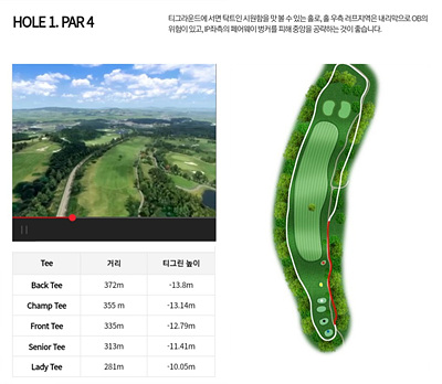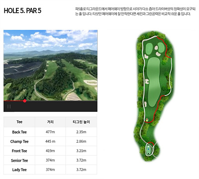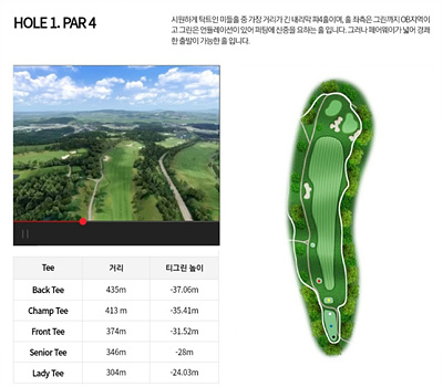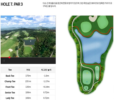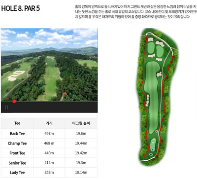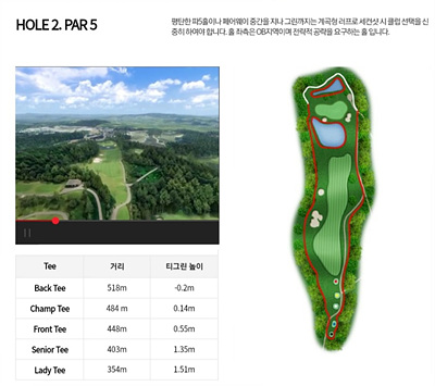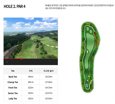 대자연과 어우러져 아름다움을 자아내는 환상적인 코스로 일상 생활에서 받은 스트레스를 날려 보낼 수 있는 힐링이 가능한 CC입니다. 비교적 쉬운 코스지만 나름대로의 전략을 가지고 도전해야 하는 코스입니다.