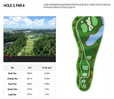3번 홀은 308m의 파 4홀입니다. 좌측은 OB지역이며 우측은 해저드입니다. 페어웨이 중간을 지나면서 연못이 있어 신경을 써야 하며 그린과 그린 사이의 벙커를 피할 수 있는 공략이 요구됩니다.