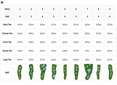 IN코스 1번홀은 374m의 파 4홀로 미들홀 중 거리가 가장 먼 내리막 홀입니다. 페어웨이의 좌우측과 그린 뒤쪽까지 OB지역입니다. 페이웨이가 넓어 편안한 출발이 가능하며 그린은 언듈레이션이 있으므로 주의를 요합니다.
