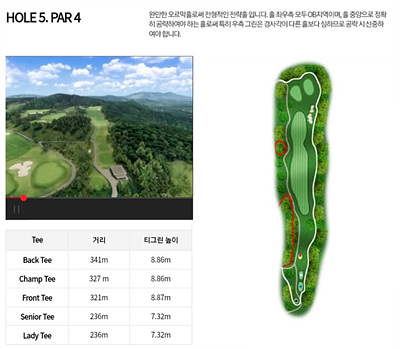 5번 홀은 321m의 오르막 홀로 전형적인 전략이 필요합니다. 티샷부터 페어웨이 왼쪽에 해저드가 있고 전체적인 코스 좌우측은 OB지역으로 중앙을 정확히 공략해야 하는 홀입니다.