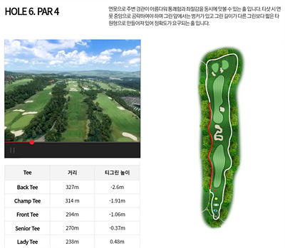 6번 홀은 294m의 파 4홀로 약간 내리막 홀이지만 페어웨이 중간 부분 러프지역에 벙커가 신경 쓰여 거리를 잘 고려하여야 하는 홀입니다.