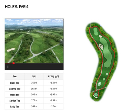 9번 홀은 303m의 파 4로 내리막 홀입니다. 전 지역이 해저드이며 좌측으로 휘어진 도그렉홀로 티샷을 페어웨이 중앙에 안착시키면 세컨드샷은 무난히 할 수 있습니다. 좌측이 단거리이긴 하지만 페어에이 왼쪽 러프지역에 있는 벙커를 피해야 합니다.