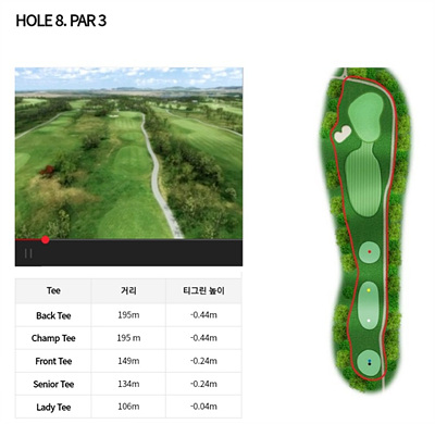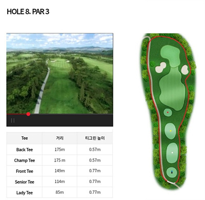 8번 홀은 149m의 파 3홀입니다. 전 지역이 해저드로 되어 있으며 그린 앞 좌우측에 있는 벙커도 신경이 쓰이고 거리를 고려한 클럽선택이 필요합니다.