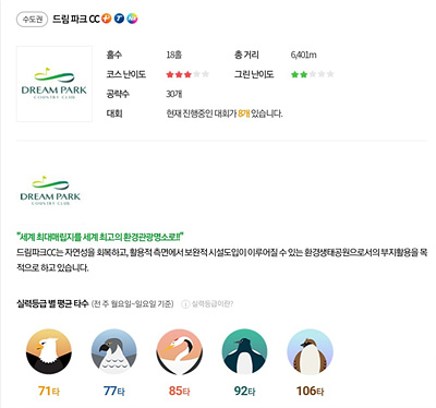 드림파크 CC는 골프존의 가상맵입니다. 총거리는 6,401m로 중급정도의 코스에 속합니다. 페어웨이 난이도는 별 3개, 그린난이도는 별 2개로 비교적 쉬운 코스에 속합니다.