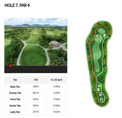 7번 홀은 325m의 파 4홀입니다. 약간 내리막이나 평지로 보면 되고 좌측으로부터 그린 우측까지는 해저드이며 티샷으로부터 페어웨이가 끝나는 우측은 OB지역입니다.