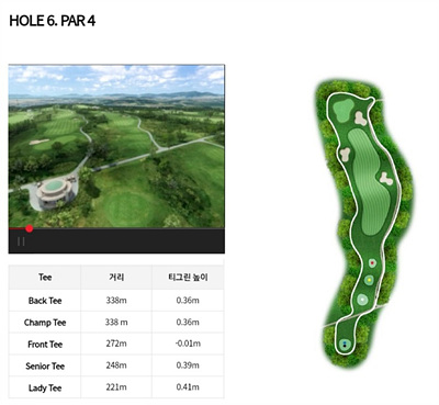 6번 홀은 272m의 파 4홀로 평탄한 홀입니다. 전 지역이 OB지역이며 티샷을 할 때 페어웨이 오른쪽에 있는 벙커를 주의해야 합니다. 페어웨이 중간 좌우측과 그린 왼쪽 앞에 벙커도 피하는 전략을 써야 합니다.