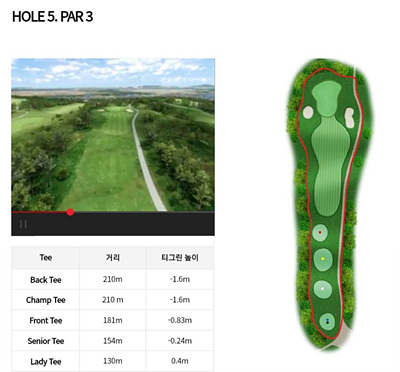 5번 홀은 181m의 파 3홀로 약간 내리막입니다. 홀 전 지역이 해저드이며 그린 앞 좌우측의 벙커를 피할 수 있는 공략이 필요합니다.