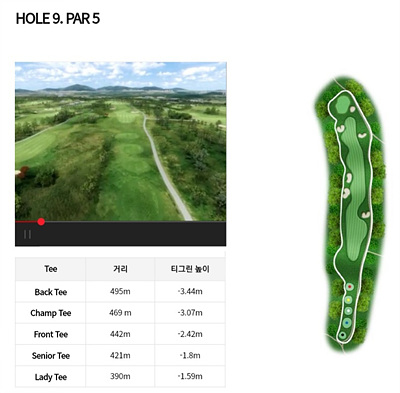 9번 홀은 442m의 파 5홀입니다. 내리막 홀로 전 지역이 OB이며 페어웨이도 넓지 않아 가운데로의 정확한 공략이 요구되며 페워웨이 양옆에 위치한 벙커를 피하는 전술이 필요합니다.