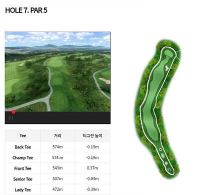 7번 홀은 543m 긴 거리의 파 5로 우측으로 약간 휘어진 도그렉홀입니다. 좌우측 전 지역이 OB이며 거리가 길지만 티샷이 우측으로 휘어지는 부분의 페어웨이에 안착되면 파세이브는 무난히 할 수 있습니다.