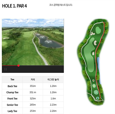 1번 홀은 325m의 약간 오르막 홀로 우측에 분수가 시원하게 물을 뿜는 경관이 아름다운 홀입니다. 우측은 해저드로 왼쪽은 OB지역으로 구성되어 있습니다. 우측 도그렉으로 티샷을 그린 중앙에 안착시키면 세컨드샷은 무난히 투온은 노려볼 만한 코스입니다.
