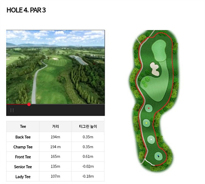 4번 홀은 페어웨이 오른쪽으로 연못이 보이는 파 3홀로 거리는 165m입니다. 전 지역이 해저드로 이루어져 있으며 거리를 고려한 신중한 클럽 선택이 중요한 홀입니다.