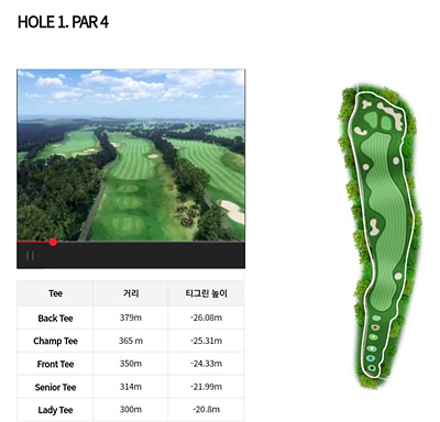 1번홀은 350의 파 4홀로 내리막이 심한 홀입니다. 페어웨이가 넓어 티샷이 무난하나 페어웨이 주변의 벙커와 그린뒤쪽의 벙커를 피하는 공략이 필요합니다.