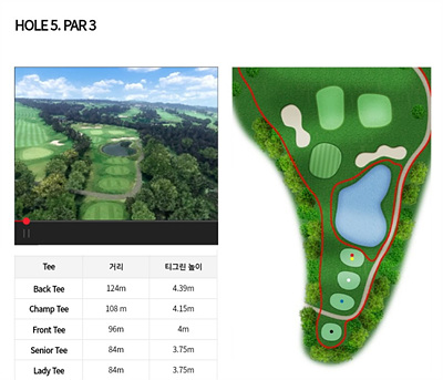 5번 홀은 96m의 파 3홀로 오르막입니다. 앞에 있는 연못과 벙커가 심리적으로 부담을 주는데요. 클럽 선택을 신중히 하여 온그린을 노려 볼만합니다.