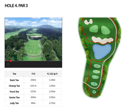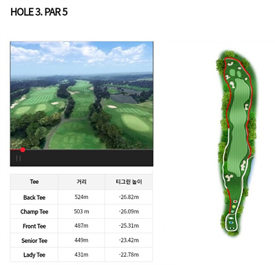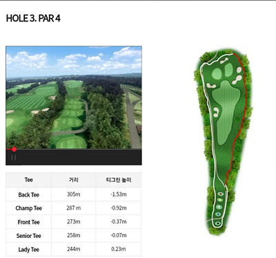 3번 홀은 273m의 파 4홀로 약간 내리막입니다. 페어웨이 왼쪽은 OB 오른쪽은 해저드 지역입니다. 그린 앞쪽의 벙커를 피하는 공략이 필요합니다.