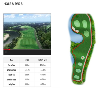 8번 홀은 122m의 파 3홀로 내리막입니다. 왼쪽에 있는 연못이 심리적으로 부담을 줄 수 있으나 내리막을 고려한 신중한 클럽선택으로 1 온을 노려보세요.