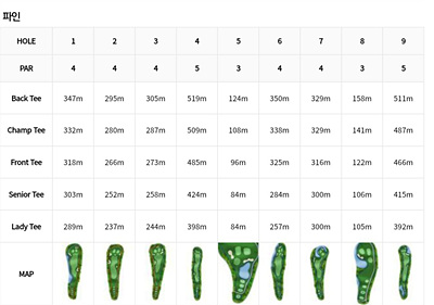 에버리스 CC는 새별과 파인 각각 9홀로 구성되어 있는데요. 각 홀의 티별 거리와 기본 맵을 살펴보면 아래와 같습니다.