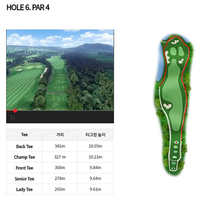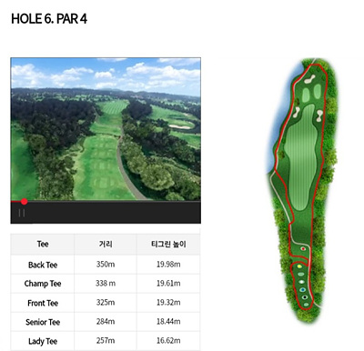 6번 홀은 325m의 오르막이 심한 홀입니다. 오르막을 고려한 거리계산이 요구되며 전 지역이 해저드입니다. 티샷에서 페어웨이까지는 러프 지역이므로 이를 넘기는 티샷을 구사하세요.