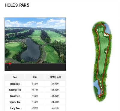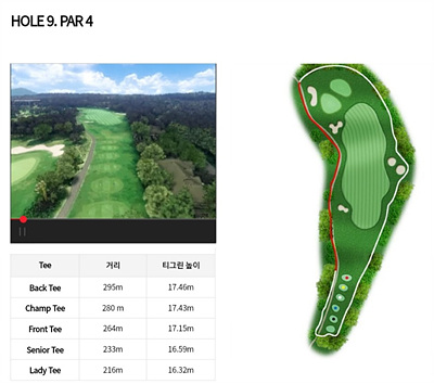 9번 홀은 264m의 파 4홀로 왼쪽으로 약간 휘어진 홀입니다. 오르막이 있어 실거리는 좀 더 길게 보아야 합니다. 그린 좌측은 해저드 오른쪽은 OB지역이므로 이를 고려한 전략을 구사해야 합니다.