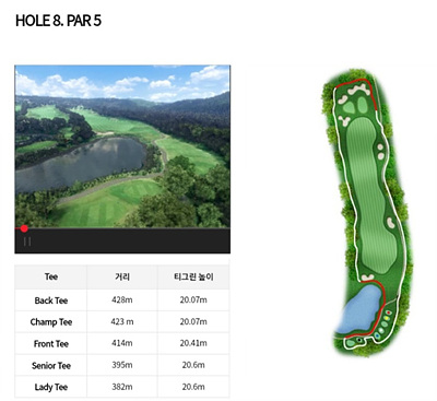 8번 홀은 414m의 파 5홀로 좌측으로 휘어진 도그렉홀입니다. 오르막이 있어 실제거리는 좀 더 멀게 봐야 합니다. 티샷 지역 앞에 있는 연못이 신경 쓰이지만 페어웨이까지 거리가 멀지 않기 때문에 정확한 드라이브 구상이 좋습니다.