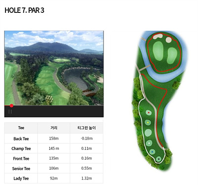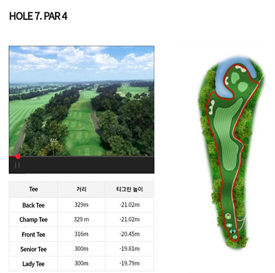 7번 홀은 316m의 파 4홀로 내리막이 심한 홀입니다. 페어웨이가 끝나는 지점부터 오른쪽으로 휘어진 곳에 그린이 있습니다. 그린은 삼면이 연못으로 둘러싸여 있고 전 지역이 해저드 지역입니다. 내리막을 고려한 거리 계산이 필요하고 세컨드샷은 해저드를 피할 수 있는 공략이 좋습니다.