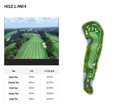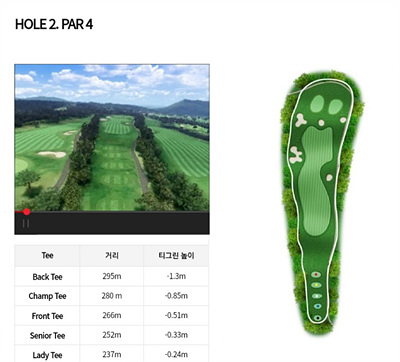2번 홀은 266m의 파 4홀로 약간 내리막입니다. 전 지역이 OB지역으로 가운데로의 정확한 티샷이 요구되며 페어웨이 중앙에 안착되면 무난히 2 온이 가능한 홀입니다.