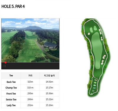 5번 홀은 295m의 오르막으로 좌로 약간 휘어진 도그렉홀입니다. 티샷을 페어웨이 중앙에 안착시키면 무난히 2 온이 가능합니다. 페어웨이 주변의 벙커를 피하는 공략이 좋습니다.