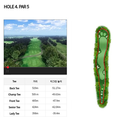 4번 홀은 485m의 파 5홀로 내리막이 심한 홀입니다. 페어웨이가 좁고 좌우측 모두 OB지역으로 정교한 샷이 필요한 코스입니다. 거리는 내리막을 고려하여 짧게 보면 좋습니다.