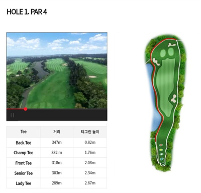 1번 홀은 318m의 파 4홀입니다. 좌측에 길게 연못이 있어 해저드 지역이며 오른쪽은 OB지역입니다. 그린중앙으로 티샷을 보내면 세컨드 공략이 좋습니다.