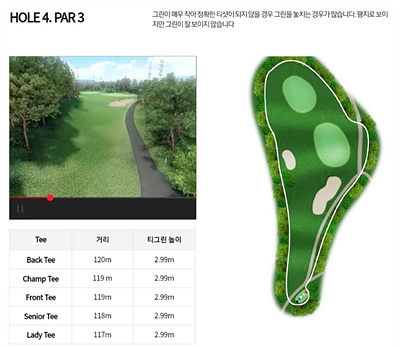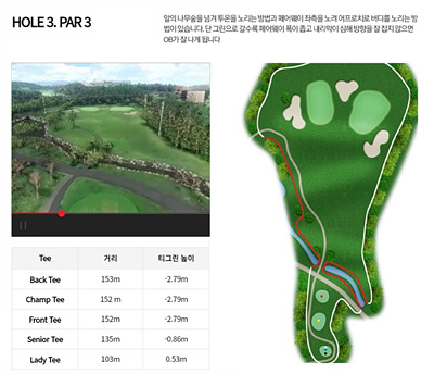 3번 홀은 152m의 내리막홀입니다. 앞의 해저드가 신경 쓰이지만 내리막을 고려하여 원온을 노려볼만합니다. 그린 주변에 있는 벙커를 피하는 전략이 중요하네요.