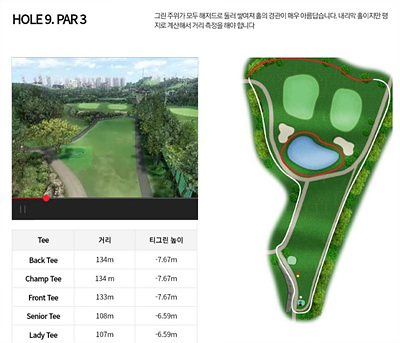 9번 홀은 133m의 파 3홀로 내리막입니다. 앞쪽의 연못이 신경쓰이지만 내리막을 고려한 클럽선택으로 거리를 잘 계산하면 원온이 충분합니다. 그린을 지나면 해저드 지역이므로 주의가 필요해요.