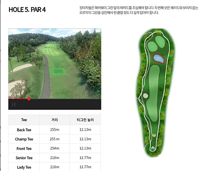 5번 홀은 254m의 파 4홀로 오르막입니다. 장타자들은 페어웨이와 그린 사이의 해저드를 고려한 티샷이 요구됩니다. 세컨드 샷은 그린이 보이지 않는 오르막으로 클럽을 길게 잡아야 좋은 점수를 낼 수 있어요.