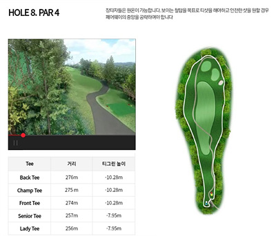 8번 홀은 274m의 파 4로 내리막이 심한 홀입니다. 내리막이 심하여 장타자들은 원온을 노려볼 만하며 티샷을 정확히 페어웨이 중앙에 공략하는 것이 중요합니다.