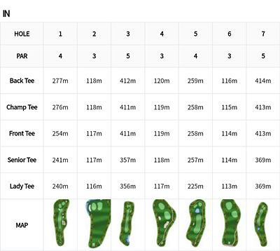 골프존카운티 구미 CC는 OUT 코스와 IN 코스로 구성되어 있는데요. 각 홀별 거리와 기본 맵을 살펴보면 아래와 같습니다.